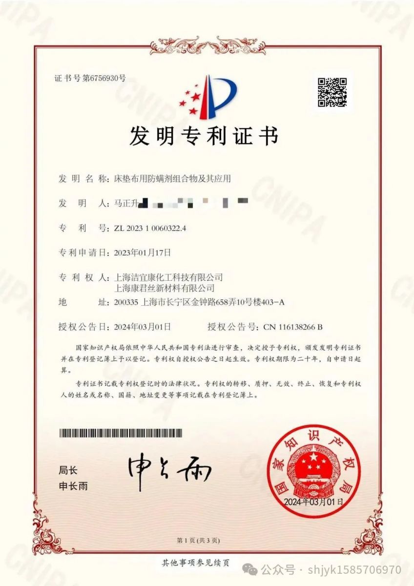 在防螨领域,上海洁宜康拥有两项重要的发明专利:“床垫布用防螨剂组合物及其应用”和“床垫布用防螨剂组合物及其应用(分案)”。这两项专利技术为公司的防螨产品提供了强大的技术支撑,使得洁宜康的防螨产品在市场上具有显著的优势。